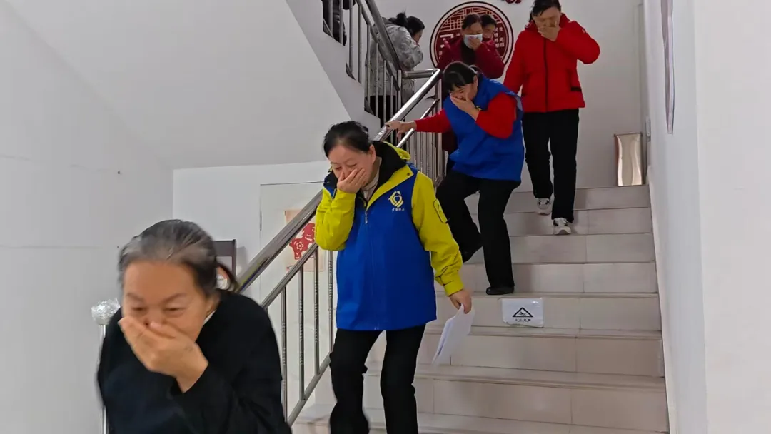 为强化逃生技能,消防员向参与居民发放了字体放大、图文并茂的消防宣传册,针对老年人行动不便、反应较慢的特点,重点讲解“低姿弯腰、湿毛巾捂口鼻、沿疏散指示标志逃生”等核心逃生要点。随后,模拟逃生演练正式开始。现场设置模拟火灾场景,烟雾弥漫中,老人们在社工和志愿者的帮扶引导下,严格按照所学逃生要领,用湿毛巾捂住口鼻,弯腰低姿,沿着疏散指示标志有序通过疏散通道,最终全员安全抵达指定集合点。整个演练过程紧张有序、规范高效,进一步提升了老人们应对突发火灾的应急反应能力和逃生自救能力。
