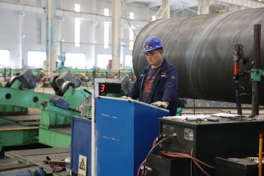 阿拉山口新博油气管道制造有限责任公司生产总监雷小兵介绍:“目前,我们已启动全部生产线,实行24小时倒班工作制,确保生产进度。通过优化生产工艺,我们的日产量较去年同期提升了11.5%,产品质量合格率稳定在99.8%以上。全体员工正以饱满的热情投入生产,全力保障订单按时交付。”