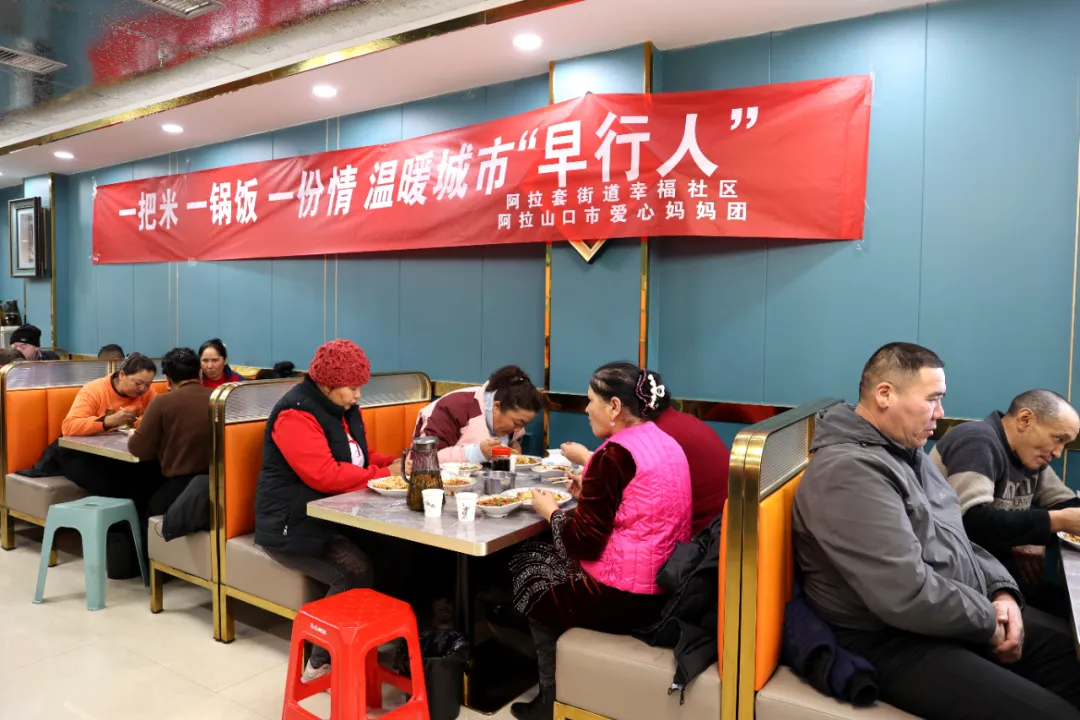 11月25日午时,阿拉山口市姊妹餐厅内香气氤氲,热气腾腾的过油肉拌面端上桌,65名身着橙色工装的环卫工人围坐在一起,品味美食,聊叙家常。这场由姊妹餐厅携手“爱心妈妈”志愿服务团队发起的“一把米 一锅饭 一份情 温暖城市‘早行人’”关爱活动,让坚守一线的环卫工人们免费吃上了地道的本土特色美食,为寒冬里的“城市美容师”带来了满满的暖意。