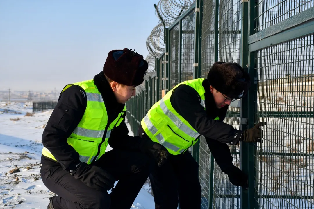 “这几天风大雪厚,围栏容易被积雪压变形,线路旁的轻飘物也可能被风吹到轨道上——这些都是中欧班列通行的‘隐形风险’。”1月20日清晨,民警谢亮亮和那苏荣裹紧防寒服,和同事们扛着工具踏上巡查路。镜头里,他们穿着荧光绿反光背心,在白茫茫的戈壁雪原上格外醒目。他们蹲身检查围栏底部的积雪堆积情况,徒手清理铁丝网挂住的塑料布,发现一处隐患后,两人合力加固被大风吹得松动的围栏立柱,呼出的白气瞬间凝成霜花。