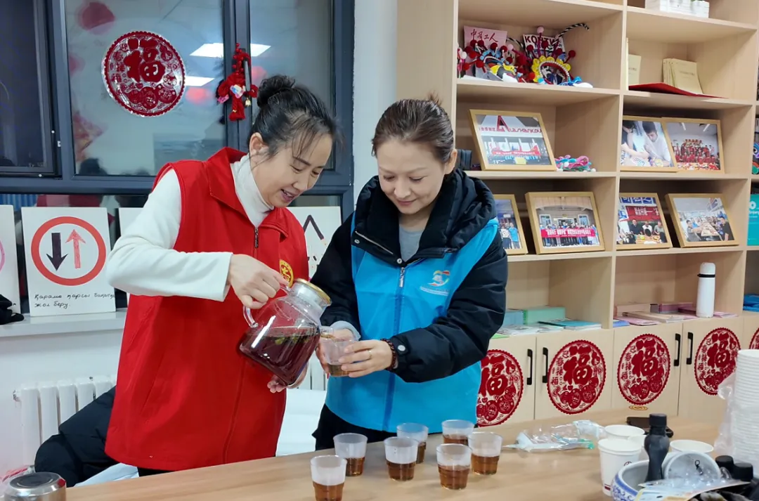 活动围绕非遗体验、年俗互动、趣味游戏等板块展开,让货运司机在繁忙运输途中沉浸式感受新春氛围。开场前,志愿者们为司机递上热腾腾的奶茶与姜茶,驱散长途跋涉的寒意。茶香氤氲间,“丝路茶香”文化交流环节吸引众人围坐,志愿者细致讲解“友邻茶”的由来与寓意。一杯杯“金色友邻”茶,成了畅叙民俗、拉近距离的温情纽带。