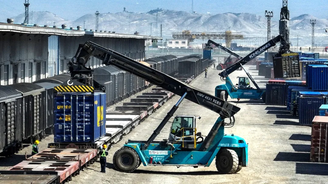 阿拉山口站装卸作业人员正驾驶正面吊,有序进行中欧班列集装箱换装工作。来源阿拉山口市融媒体中心图库