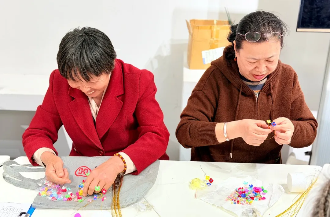 课堂上,授课老师全程“手把手”教学,从材料选用、基础技法到创意搭配分步示范,对动手较慢的老年居民耐心协助穿引、塑形,确保每位居民都能跟上教学节奏。大家围坐一堂,相互请教技巧、分享创作思路,有的跟着老师一步步模仿,有的发挥想象大胆创新,邻里间的距离在指尖互动中悄然拉近。