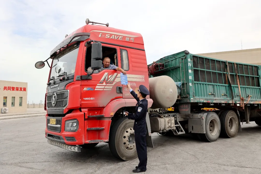 民警向货车司机发放宣传资料。牛宁 摄