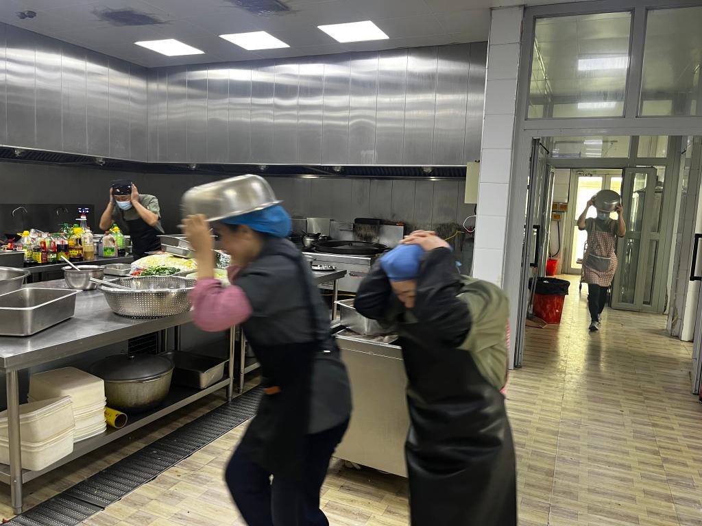为进一步增强机关食堂从业人员地震灾害防范意识,提高突发地震时的应急避险、自救互救及快速疏散能力,筑牢食堂应急安全防护网,近日,市机关事务服务中心在食堂组织开展地震应急避险疏散演练,24名从业人员全程参与。