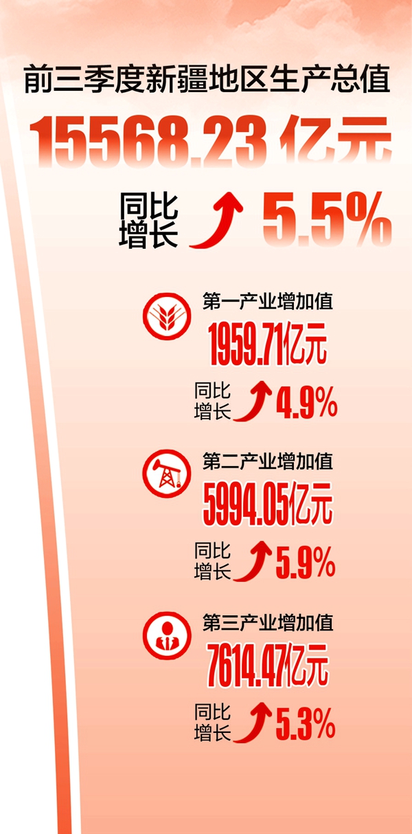 10月27日,前三季度新疆经济运行成绩单出炉:根据地区生产总值统一核算结果,前三季度新疆地区生产总值15568.23亿元,按不变价格计算,同比增长5.5%。