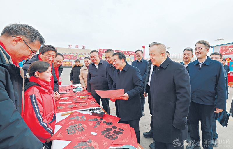 疏附县疆南农副产品批发市场里正举办年货大集,各类特色商品琳琅满目,写春联、送福字活动备受欢迎,现场洋溢着浓浓的年味儿。陈小江、艾尔肯·吐尼亚孜饶有兴致地察看年货摊位,了解蔬菜等农副产品供应情况。陈小江叮嘱有关负责同志,加强货源组织和产销对接,丰富节日市场供给,全力保障民生商品供应充足、价格稳定、质量放心。