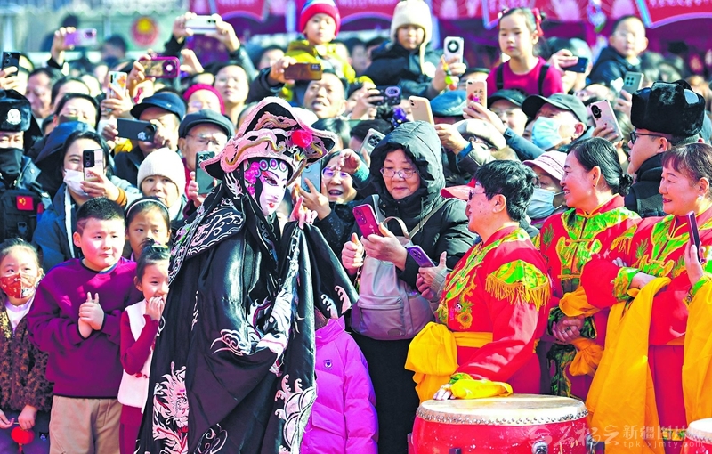 2月18日,川剧变脸演员与群众互动。2月17日,乌鲁木齐市红山公园第九届新春庙会启幕,这场集民俗、美食、娱乐、文化于一体的盛宴,让年味在烟火气中升腾。□石榴云/新疆日报记者汤永摄
