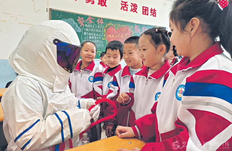 3月2日,哈密市第四小学学生与人偶宇航员交流。□叶翠摄