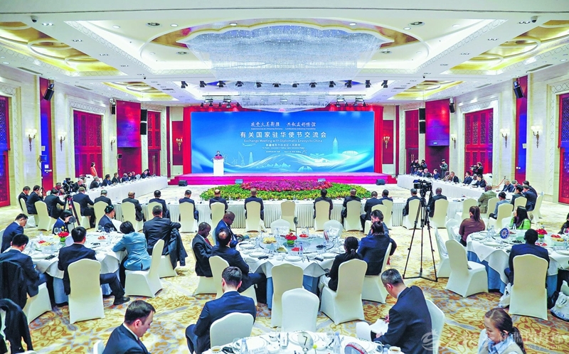 北京新疆大厦木卡姆厅洋溢着热烈友好的氛围。来自40个国家的驻华大使、外交官和有关国际组织代表出席交流会。