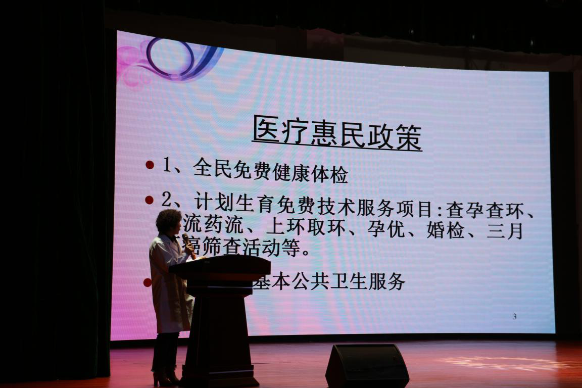 为了提高阿拉山口市各族人民群众健康水平,引导群众树立健康观念,养成健康行为提高健康素养,改善主要健康指示,避免发生“因病致贫”现象,阿拉山口市卫计委牵头组织市人民医院开展“健康进万家”活动,1月24日晚在艾比湖镇百姓大舞台举办“健康进万家,幸福伴我行”健康知识讲座为了进一步加强女性生殖健康,提高育龄妇女的自我保健意识及防治意识,树立健康生活观念由计生指导站于主任给居民群众讲解健康和计生知识。主要讲解生殖健康知识,增强家庭幸福感,对有不良健康生活方式、行为等人群开展健康生活方式、行为的进行指导,使其转变健康理念,改变行为,促进健康。人民群众的生活水平每年都在提高,对健康的要求也不断提高。希望女性同胞增强保健意识,提高妇科疾病的预防能力。发现问题应及时治疗,养成预防为主,治疗为辅的健康理念。