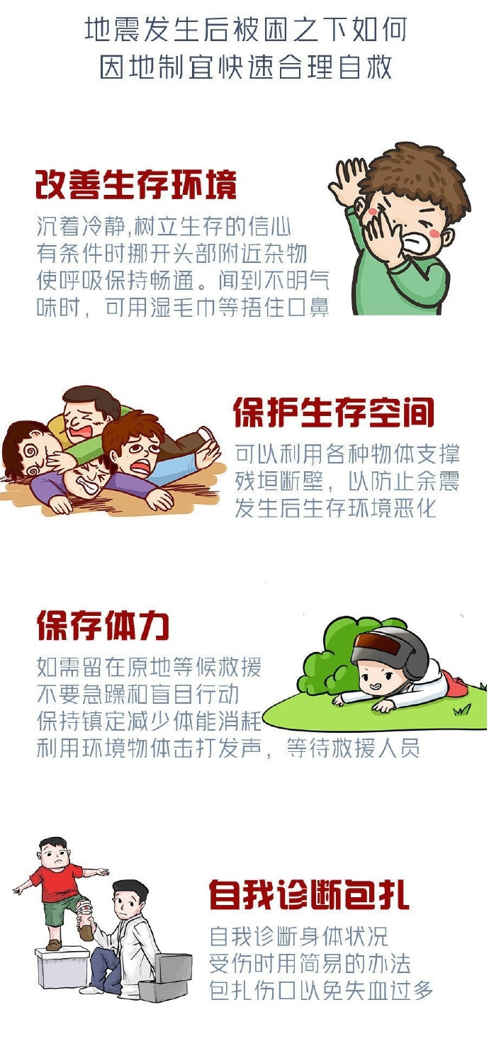 如果地震中被困,该如何自救?提醒:尽可能挪开杂物,保持呼吸畅通,有不明气味时要用湿毛巾捂住口鼻;利用各种物体支撑残垣断壁,防止余震后生存环境恶化;保存体力,用物体击打声求救;简单包扎,危重人员要及时做心肺复苏……详细操作方法,请戳图了解↓
