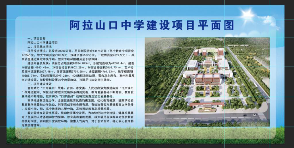 阿拉山口中学建设项目总占地面积九万多平方米,总建筑面积为四万多平方米;规划建设宿舍楼、艺术楼及图书馆、体育馆、食堂、教学楼、实验楼、400米标准运动场、看台及主席台等。学校规划设置30个教学班级,可满足千余名名学生就学。
