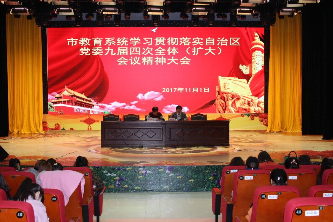 11月1日晚,市教育系统召开学习贯彻落实自治区党委九届四次全体(扩大)会议精神的专题会议。会议由市教育局局长孙红卫主持。市中学校长白志强及全体干部教职工120余人参加。会上,白志强校长传达了自治区党委九届四次全会精神。