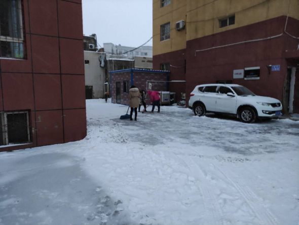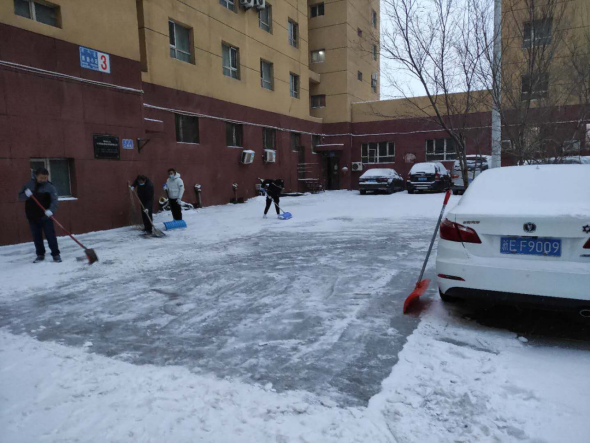 社区工作人员、下沉干部第一时间赶到工作岗位,组织社区志愿者、辖区居民对辖区各小区道路积雪进行清理。大家不畏严寒、不怕辛苦,冒着纷纷飘落的雪花,拿着扫帚,手持铁锹,撸起袖子,你一笤帚,我一铁锹,干得热火朝天。同时,社区干部向沿街商铺、门店宣传商铺“门前五包”,倡导广大居民朋友们积极行动起来,加入到清扫积雪的活动中,同心协力、共御冰雪。经过大家两个多小时的共同努力,小区的主干道、楼前小路上的积雪都被清理的干干净净,极大地方便了居民的出行。