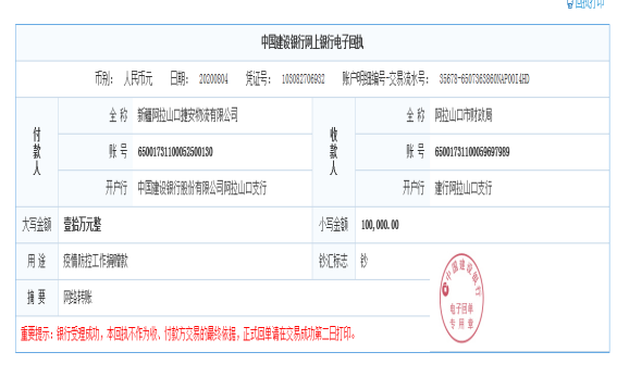 疫情无情人有人,爱心捐款见真情。阿拉山口市亿利达纺织有限公司向全市捐款5万元,阿拉山口捷安物流有限公司向全市捐款10万元。