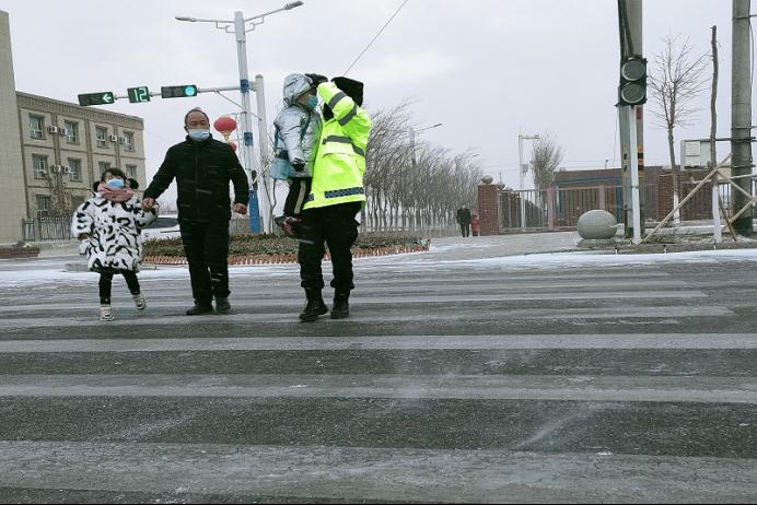 11月19日,阿拉山口市突起风吹恶劣天气,气温骤降,为进一步提升群众安全感和满意度,确保全体师生的人身安全,阿拉山口市公安局博乐街便民警务站民警不畏风雪持续做好“护学岗”工作,切实为师生撑起“安全伞”。