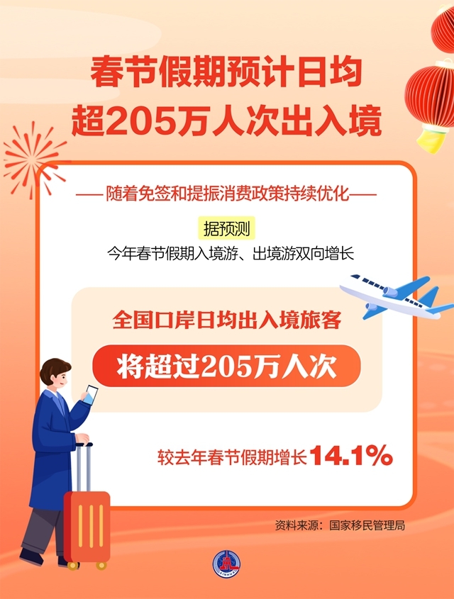 记者2月12日从国家移民管理局获悉,随着免签和提振消费政策持续优化,据预测,今年春节假期入境游、出境游双向增长,全国口岸日均出入境旅客将超过205万人次,较去年春节假期增长14.1%。
