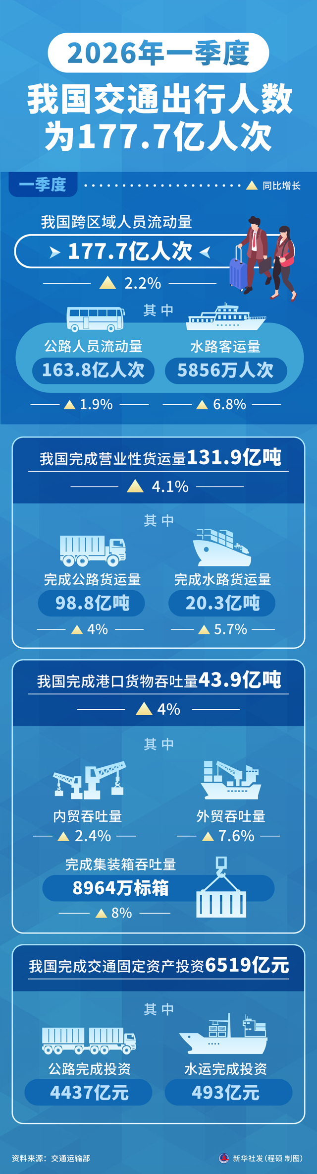 记者4月22日从交通运输部获悉,一季度,我国跨区域人员流动量为177.7亿人次,同比增长2.2%。其中,公路人员流动量为163.8亿人次,同比增长1.9%;水路客运量为5856万人次,同比增长6.8%。