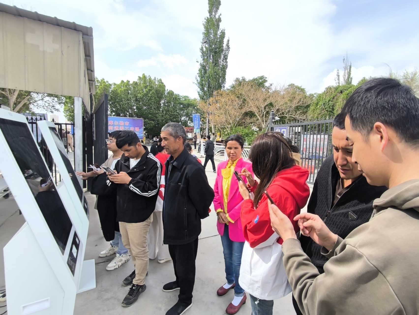 在库尔勒市零工市场,群众正在使用自助查询机查询岗位。