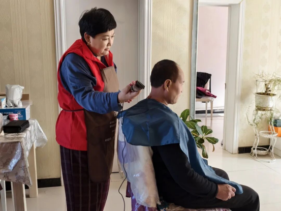 “我年纪大了,腿脚不方便,出门理发特别麻烦,社区心系我们,把理发师请到家里来为我理发,太贴心了!剪完头发感觉整个人清爽多了。”友谊苑小区的侯爷爷理完发后,看着镜子里的新发型,连连为社区的暖心服务点赞。