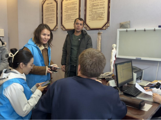 活动现场,中医团队为中外货运司机提供沉浸式特色诊疗。中医师们通过号脉细致了解司机们的身体状况,结合长途奔波的职业特点,针对性地进行健康评估;针对不少外籍司机对中医理疗不熟悉、担心针灸疼痛的情况,医师耐心讲解针灸原理、操作方法与安全常识,配合双语志愿者同步翻译和生动比喻,一步步打消大家的顾虑。来自哈萨克斯坦的司机别克起初对针灸十分畏惧,担心会有强烈痛感。在医生和志愿者的细致讲解下,他放下心理负担尝试体验了针灸理疗。结束后,他惊喜地表示:“完全没有想象中的疼痛,反而感觉肩颈的僵硬感缓解了很多,中医真的很神奇!”